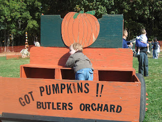 The neighbors would hand a piece of candy to Evan and he would put it in his pumpkin and wave bye-bye! He even told one pumpkin bye!