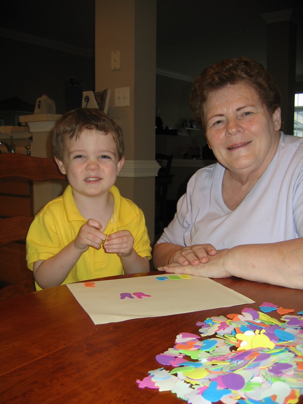 Grandma brought me foam stickers to use with my artwork. Here we are making a masterpiece...